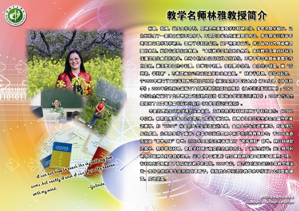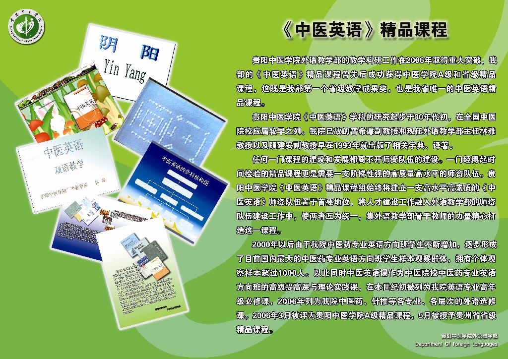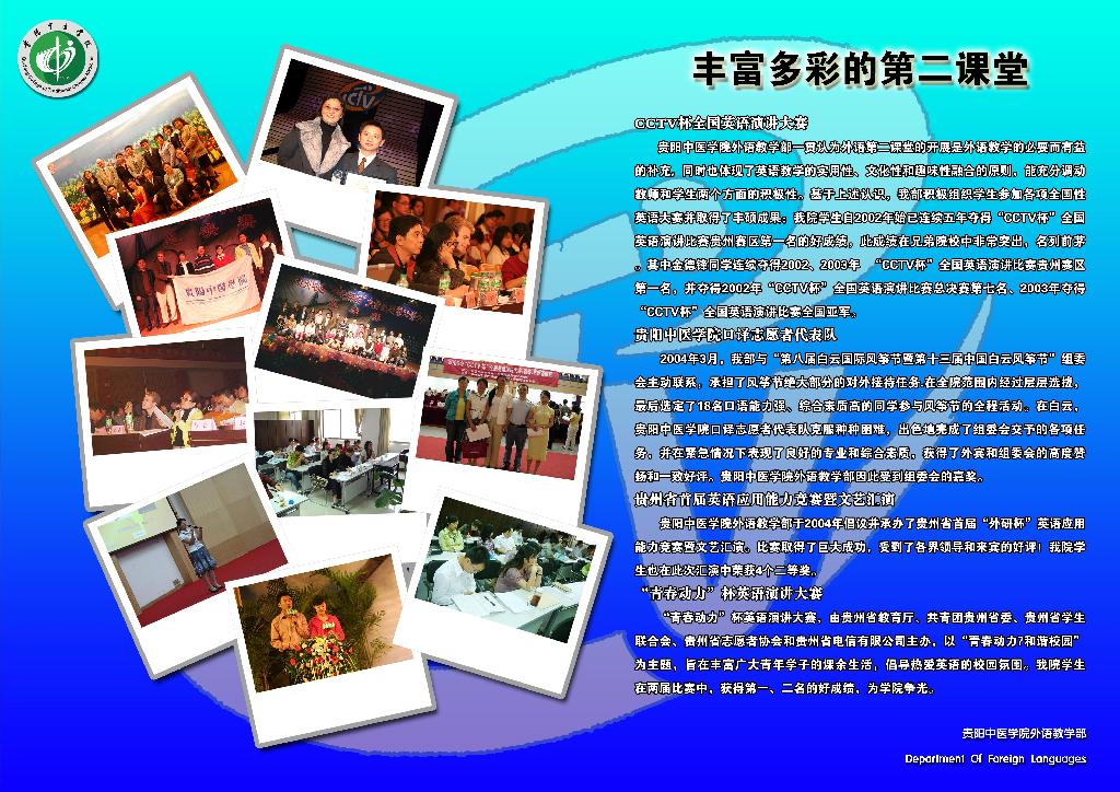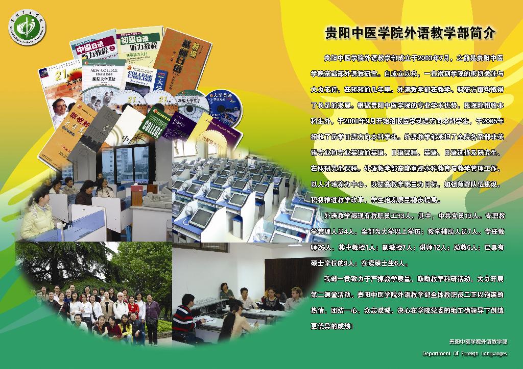 365bet足球联赛自成立以来,自成立以来,外语教学部在学院党委的正确领导下本着科学、创新、发展、稳步前进的原则努力进行教学科研改革,严抓教学质量和师资队伍建设,积极开展第二课堂活动。目前教学质量稳步提高、科研力量不断壮大、四六级过级率明显增长。贵阳中医学院外语教学部正以自信、团结的步伐与前进中的贵阳中医学院一起迎接冉冉升起的旭日、迈向辉煌的未来。