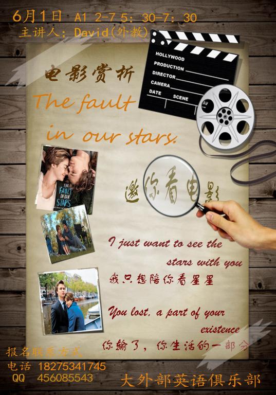 365bet足球联赛英语俱乐部影视欣赏小组将于2015年6月1日晚上5时30分在花溪校区A1栋2-7教室举行成立后的第一次活动,届时活动上会有好看的电影、还会有外教精彩的点评、更会有英语激情的释放。