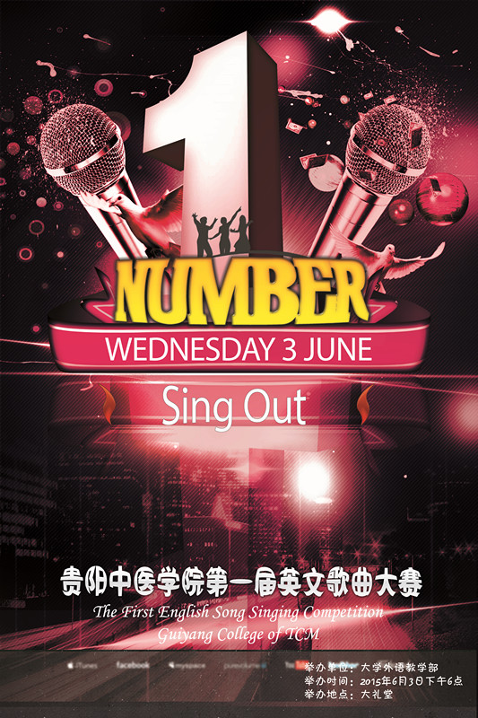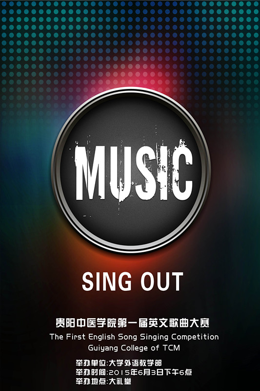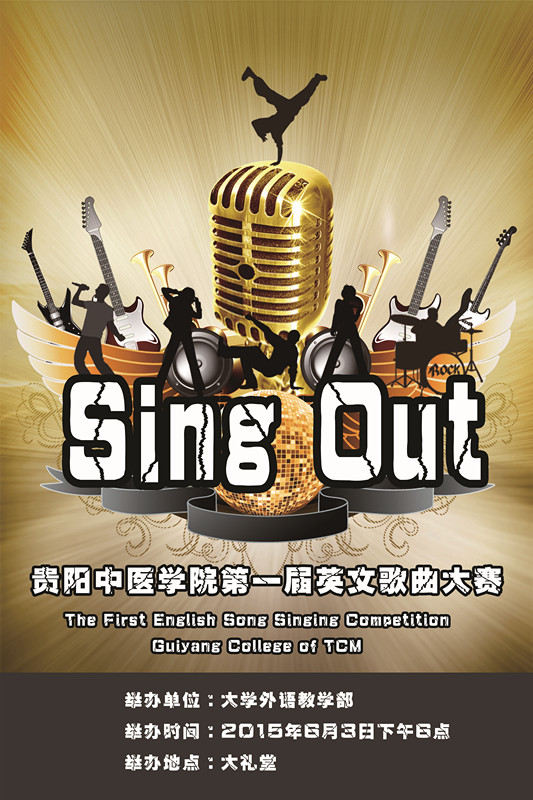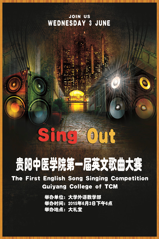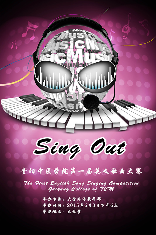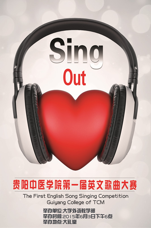 由外语教学部主办的贵阳中医学院第一届英语歌曲大赛决赛将于2015年6月3日晚上6时在花溪校区大礼堂举行,届时大礼堂的舞台上将会有12队实力雄厚的选手们为大家奉献上一场精彩的视听盛宴。除了选手们的精彩演出外,决赛现场还会有特殊嘉宾的神秘节目哦,还等什么,同学们!请记住2015年6月3日晚6时大礼堂不见不散!